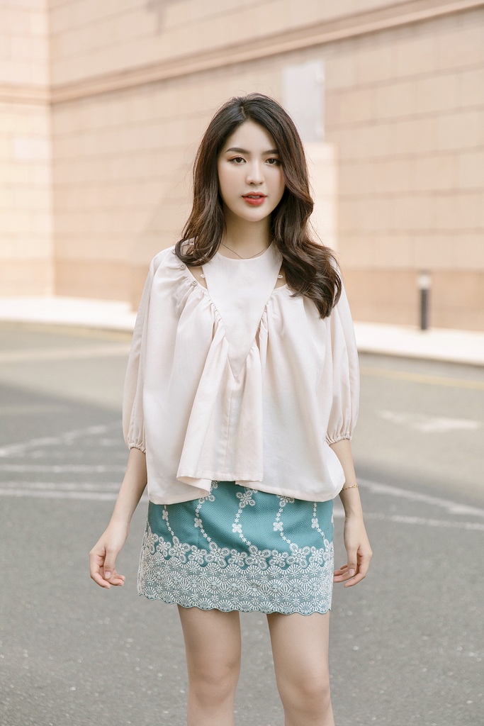 Áo nhún tam giác đổ xuống ngực, hở tam giác 2 vai đính nút tay phồng