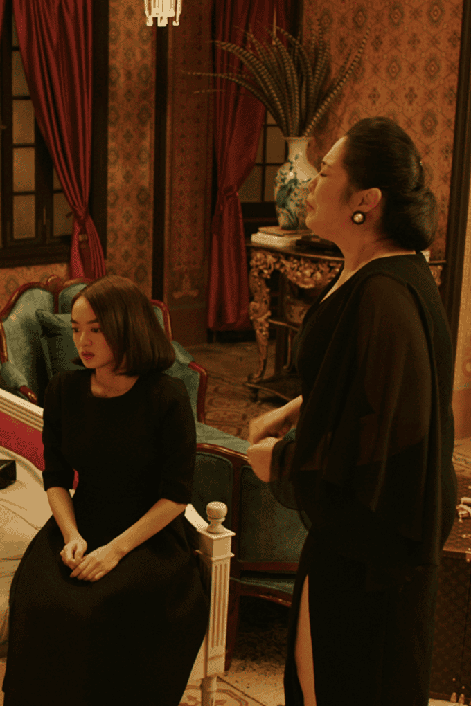 Kaity Nguyễn và Hồng Vân mặc màu đen trong một phân đoạn diễn xuất nội tâm.